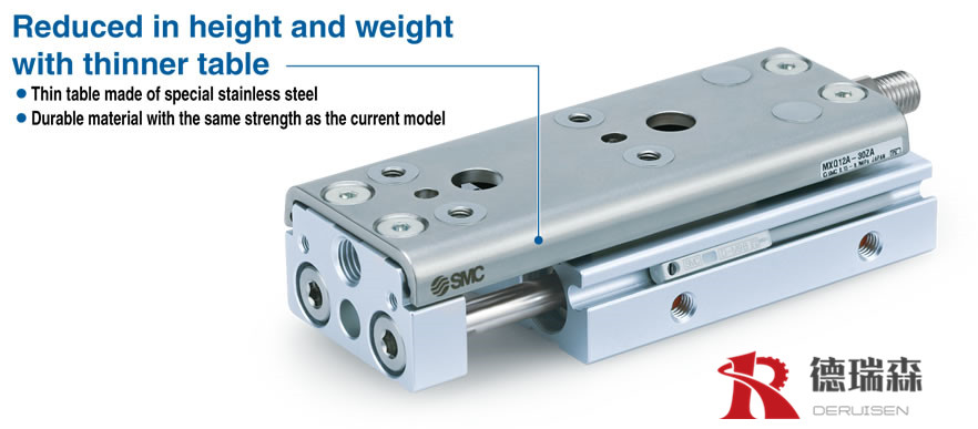 SMC气动滑台MXS特点:形式系列/CAD动作方式缸径 (mm)标准型MXS 双作用6,8,12,16,20,25对称形MXS□L 特长工作台与气缸紧凑的一体化。*适合精密组装用的气动滑台。高刚性/高精度。由于采用十字滚柱导轨,可实现无松动的平稳运动。小型/轻量。由于采用双缸结构,得到两倍的输出力。